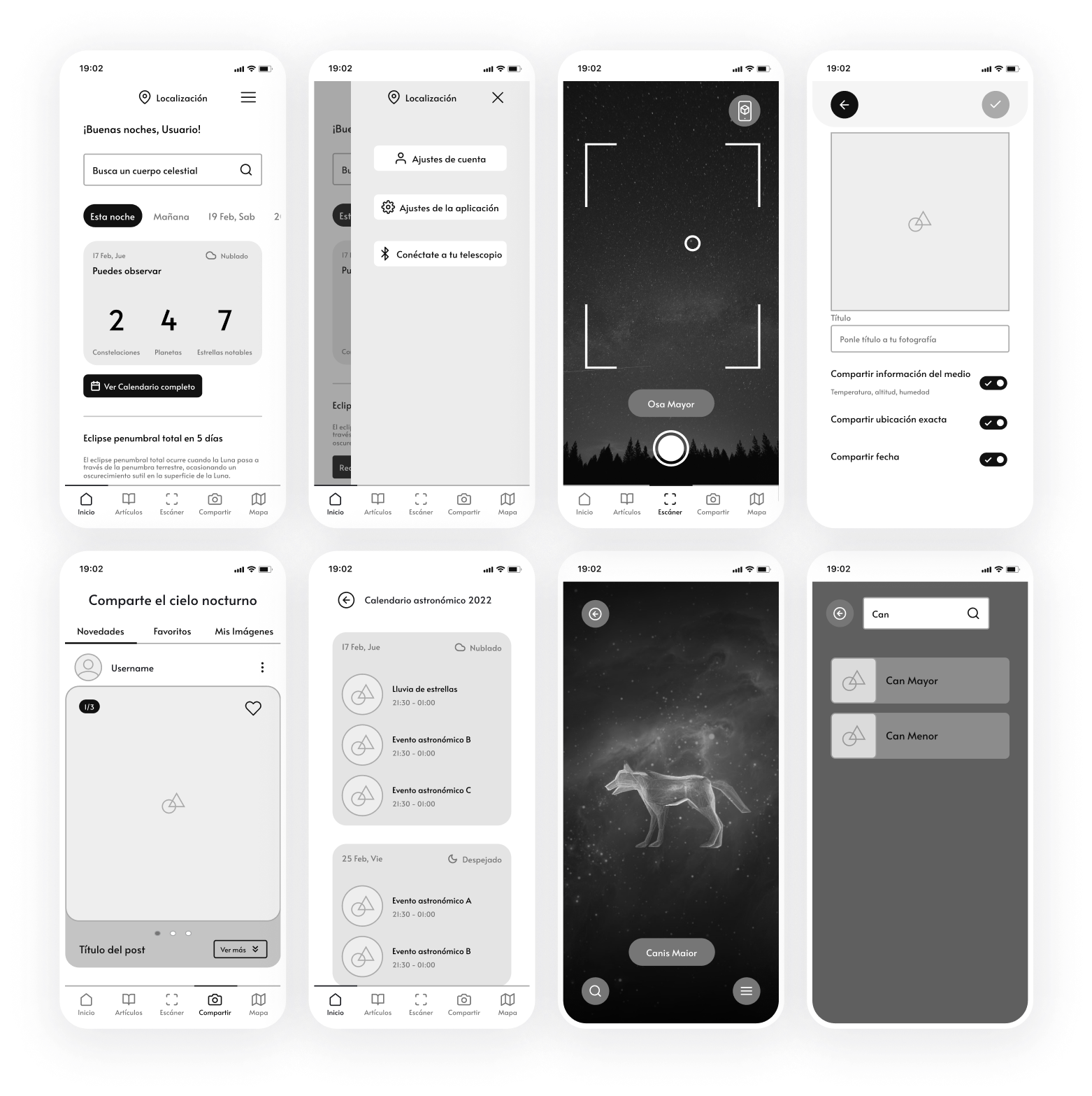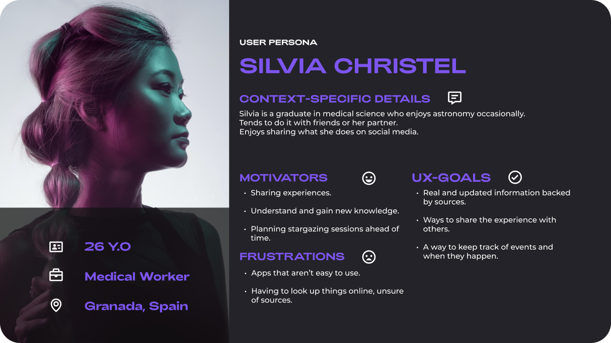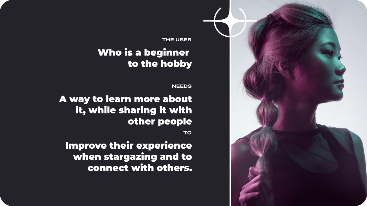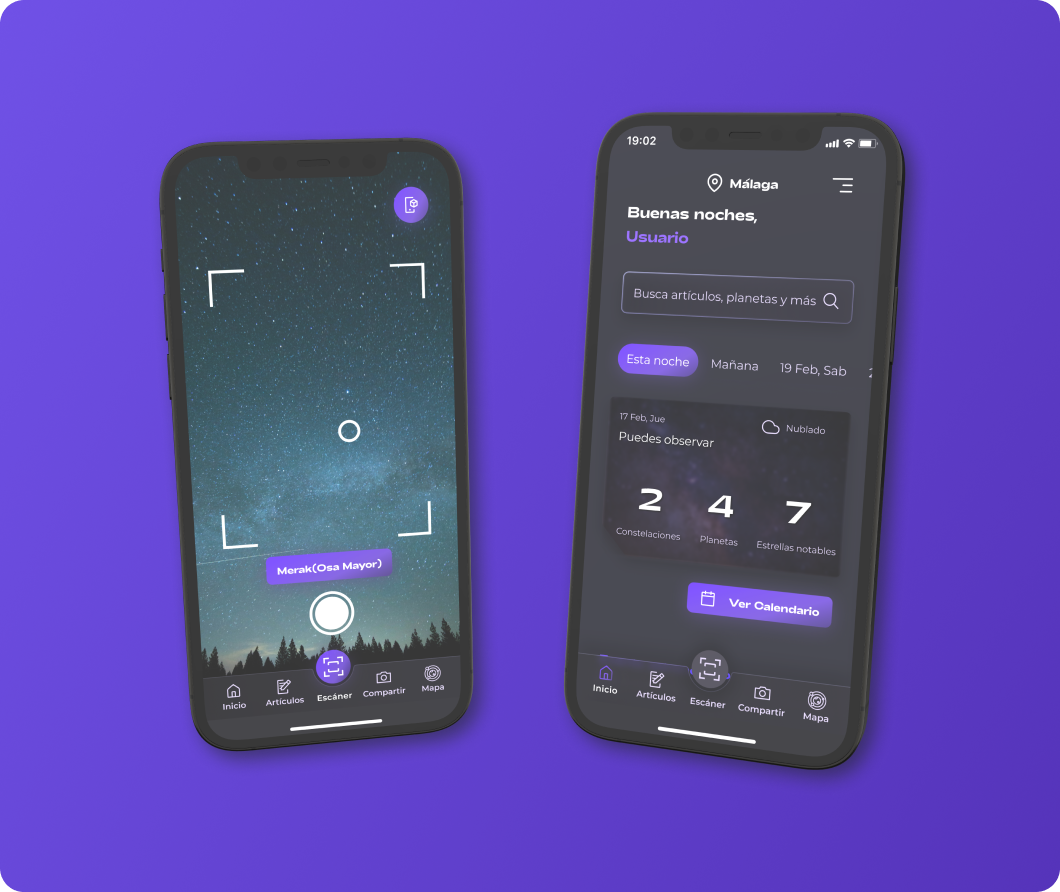 The majority of stargazing apps are very polarizing, they either appeal to people who already know a lot about the hobby, which makes them not very appealing to first time users, or are quite bare in the features they offer, making them unsuitable for the more experienced hobbyists. Also, most of them don’t let you share the experience with others, so I set out with the goal of designing an app that met those demands.