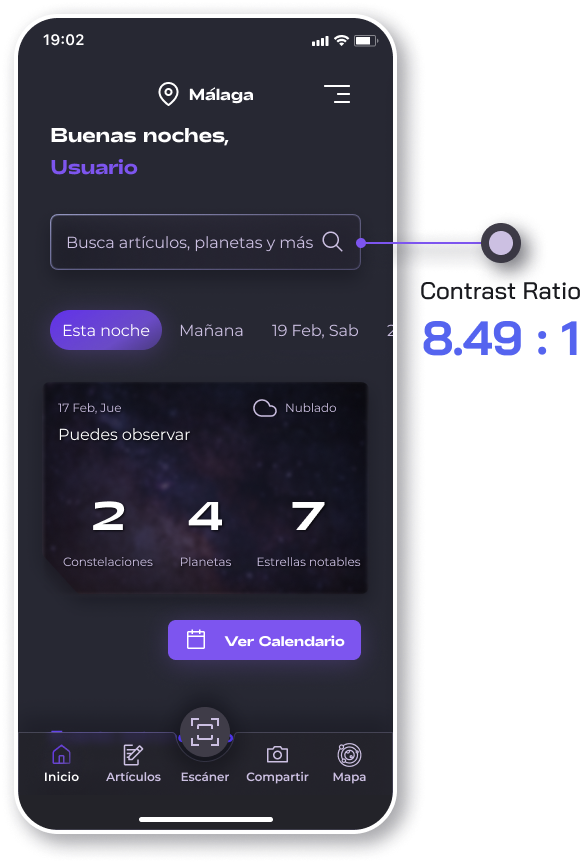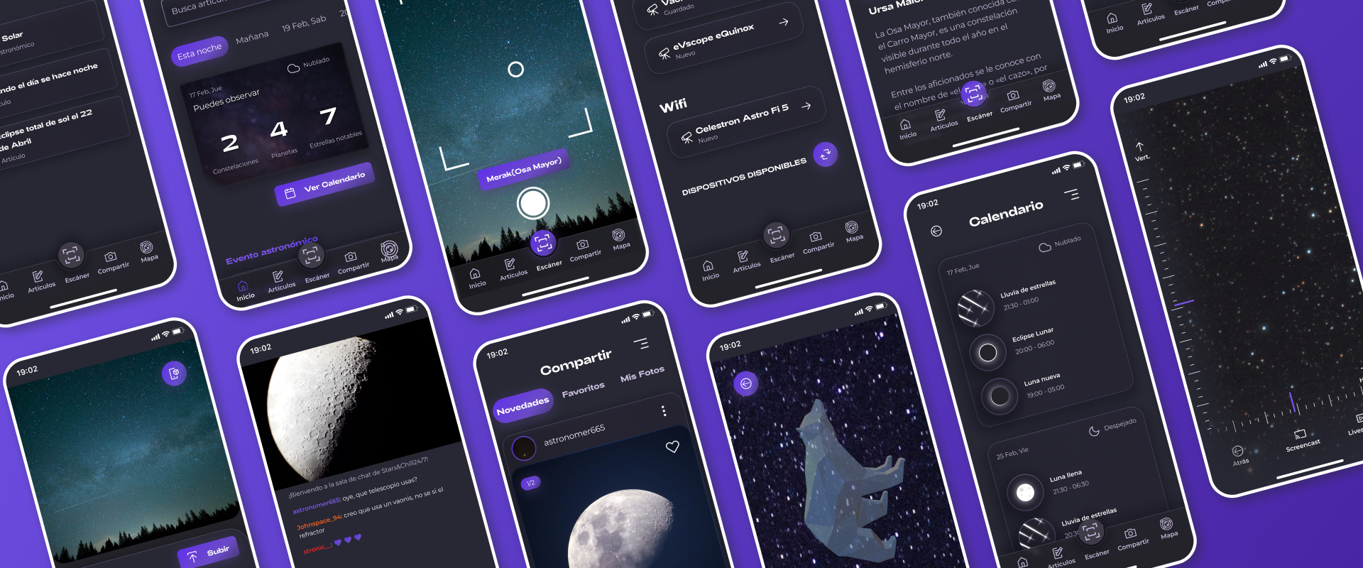 I wanted to create an easy experience for the target users, making an emphasis on simplicity, giving users the possibility of sharing their stargazing experiencies via images and live video, providing popular and useful features that users of these types of apps might be accustomed to, and making sure the navigation was comfortable, simple and painless.