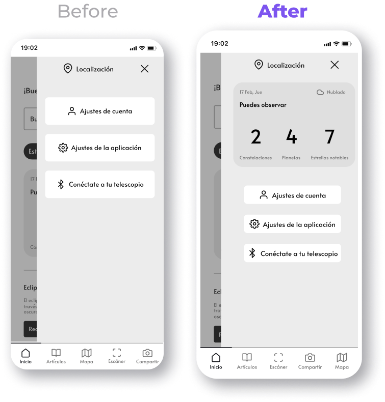 The main tasks included going through the login/signup and onboarding process, checking the calendar of astral events, using the scanner and getting information for a constellation, taking a picture of it and uploading it, checking information from other users' pictures, connecting a telescope and streaming the feed and playing around with the star map.