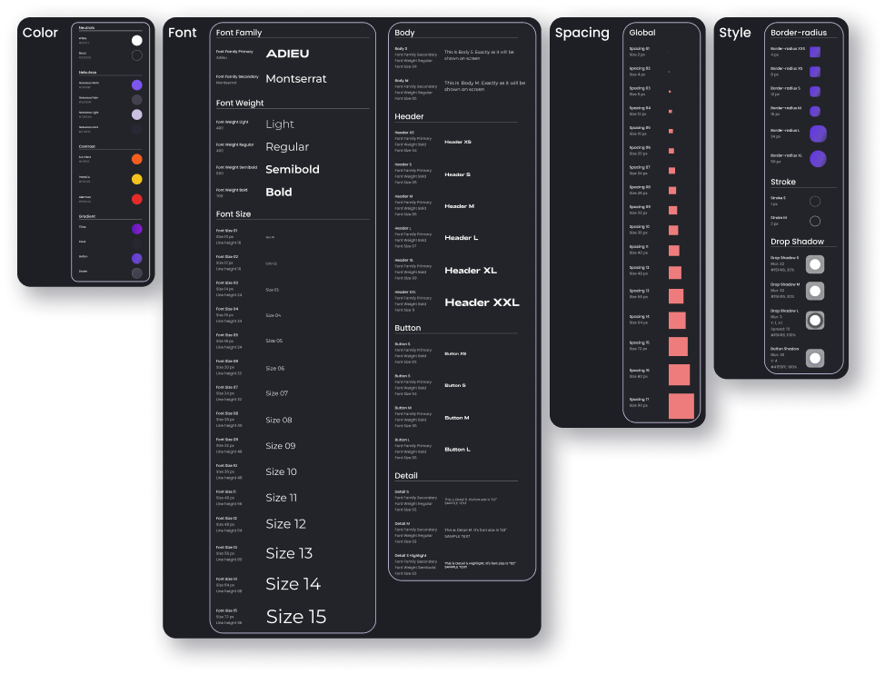Once I completed the information architecture and I made a prototype from the wireframes, I started making a design system from which the screens would be created.